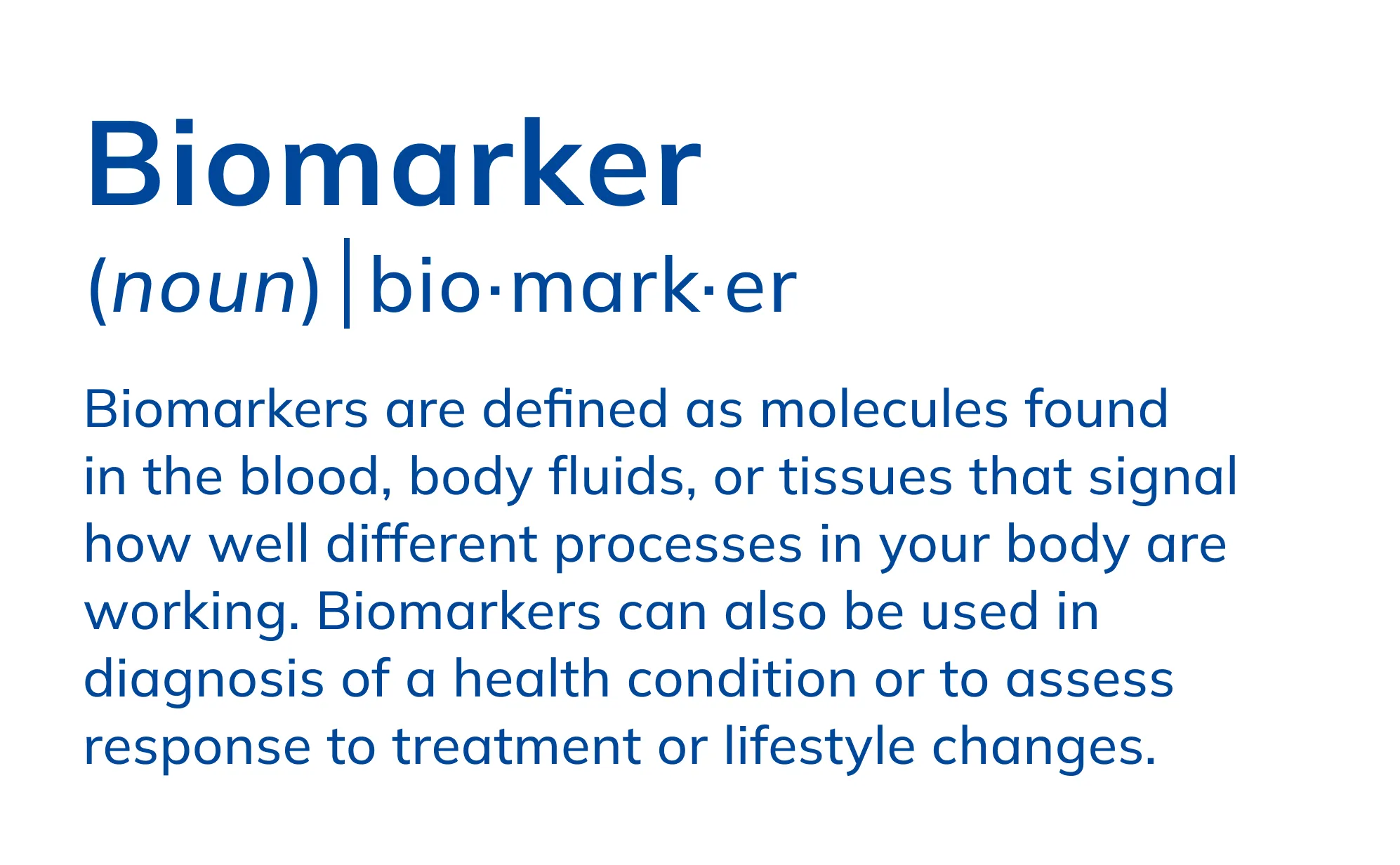 Biomarkers are defined as molecules found in the blood, body fluids, or tissues that signal how well different processes in your body are working. Biomarkers can also be used in diagnosis of a health condition or to assess response to treatment or lifestyle changes.