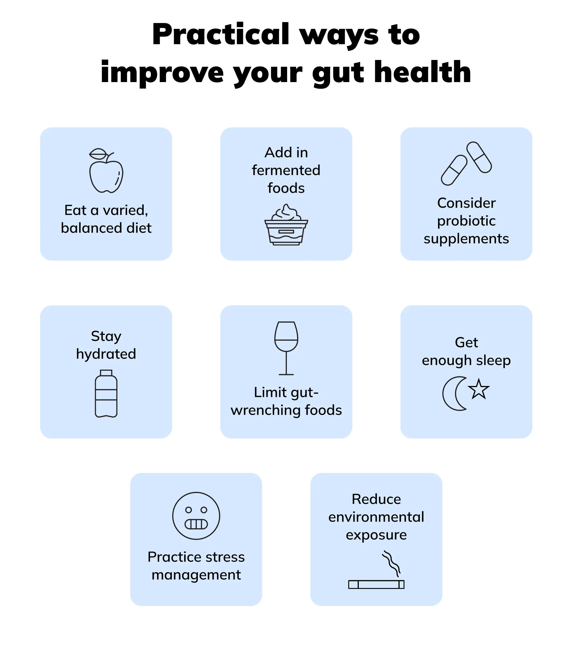 - Lifestyle changes can alter your gut microbiome in a positive way. Be sure to eat a healthy, balanced plant-based diet, limit ultra-processed foods, added sugars, and excessive alcohol, get regular exercise, adequate sleep, and practice stress management.