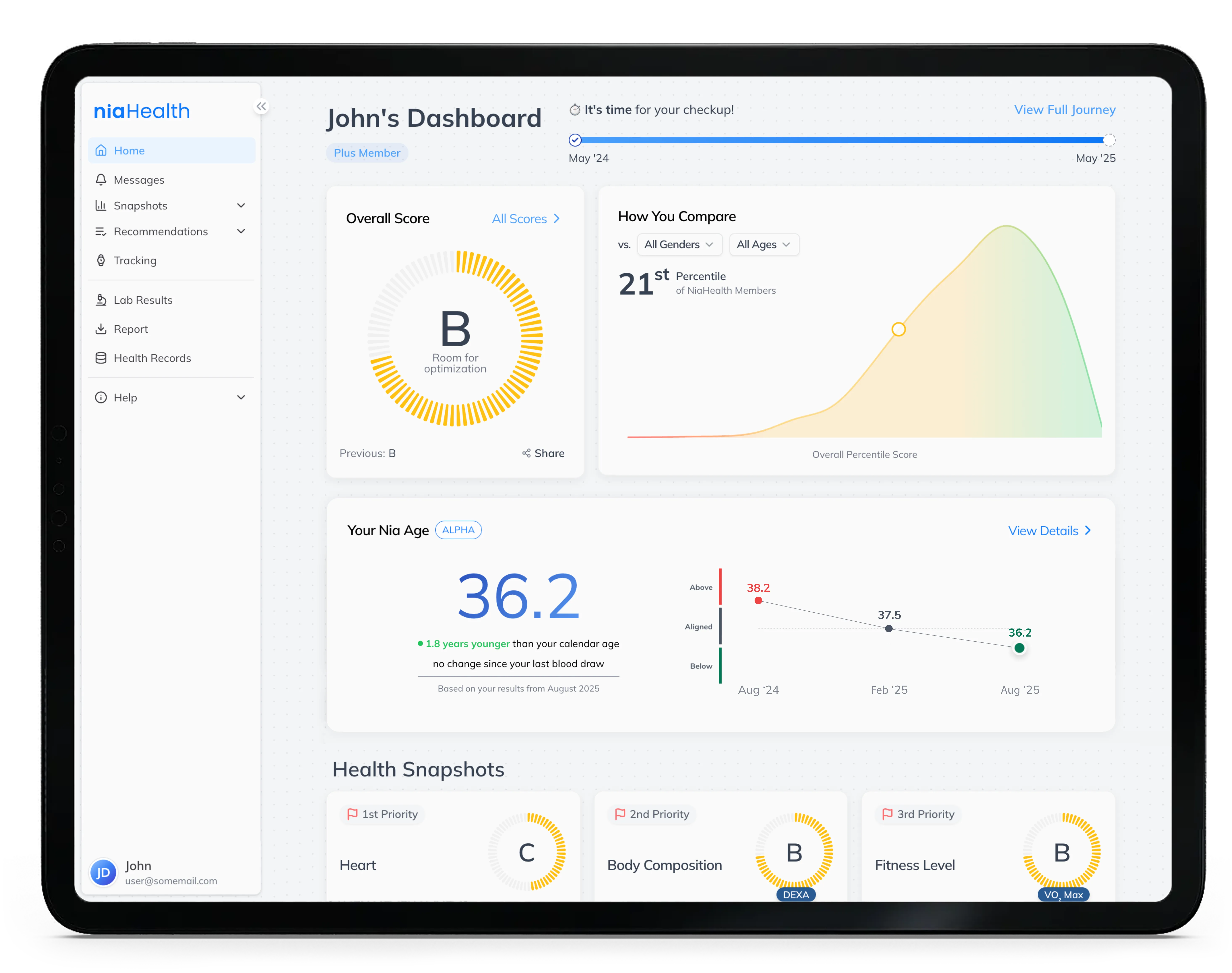 NiaAge addresses this by taking age into account; comparing you to people your own age, not to a 25-year-old or an unrealistic population average.
