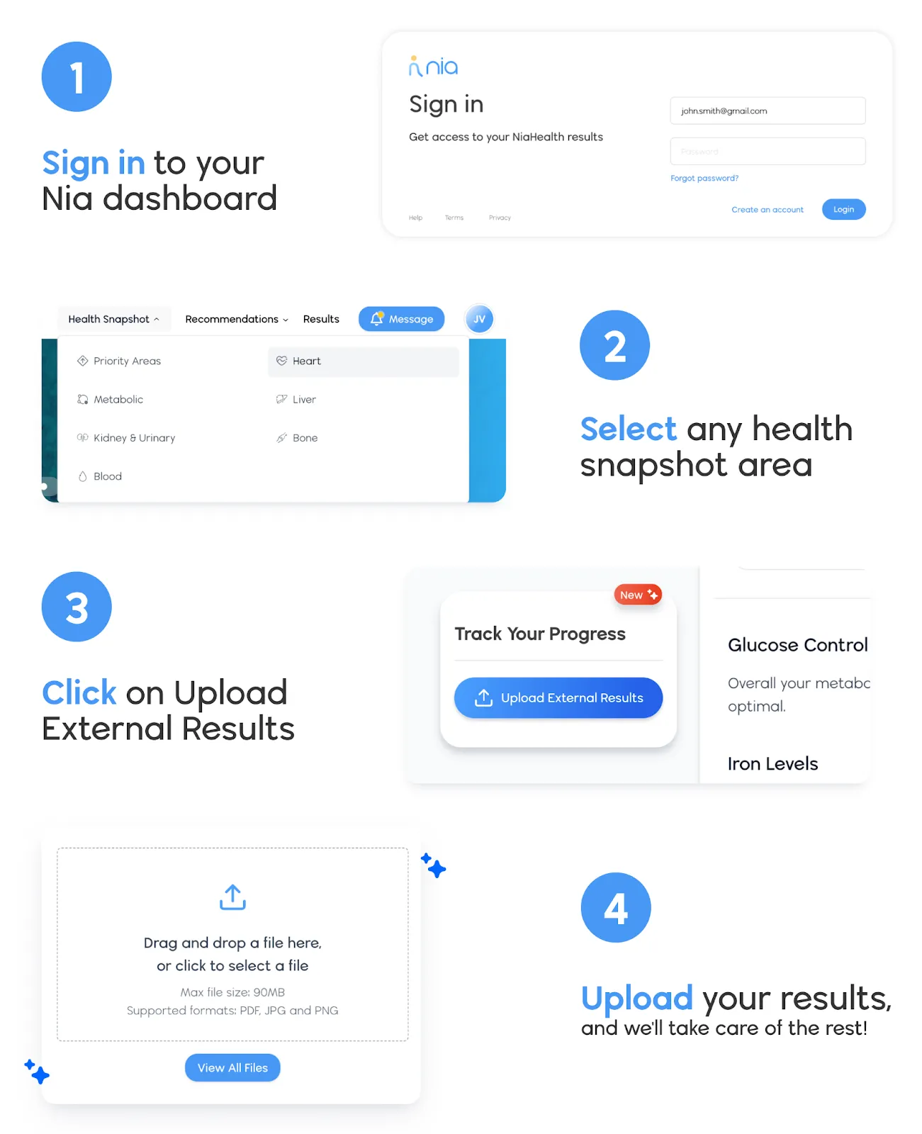 We’ve received your valuable feedback and taken it to heart. Whether you’re aiming to improve your fitness, enhance your diet, or optimize your overall well-being, having a clear view of your journey is crucial. That’s why we’re excited to announce a new feature added to NiaHealth’s interactive dashboard: the ability to upload any external clinical blood draw results to your Nia dashboard!