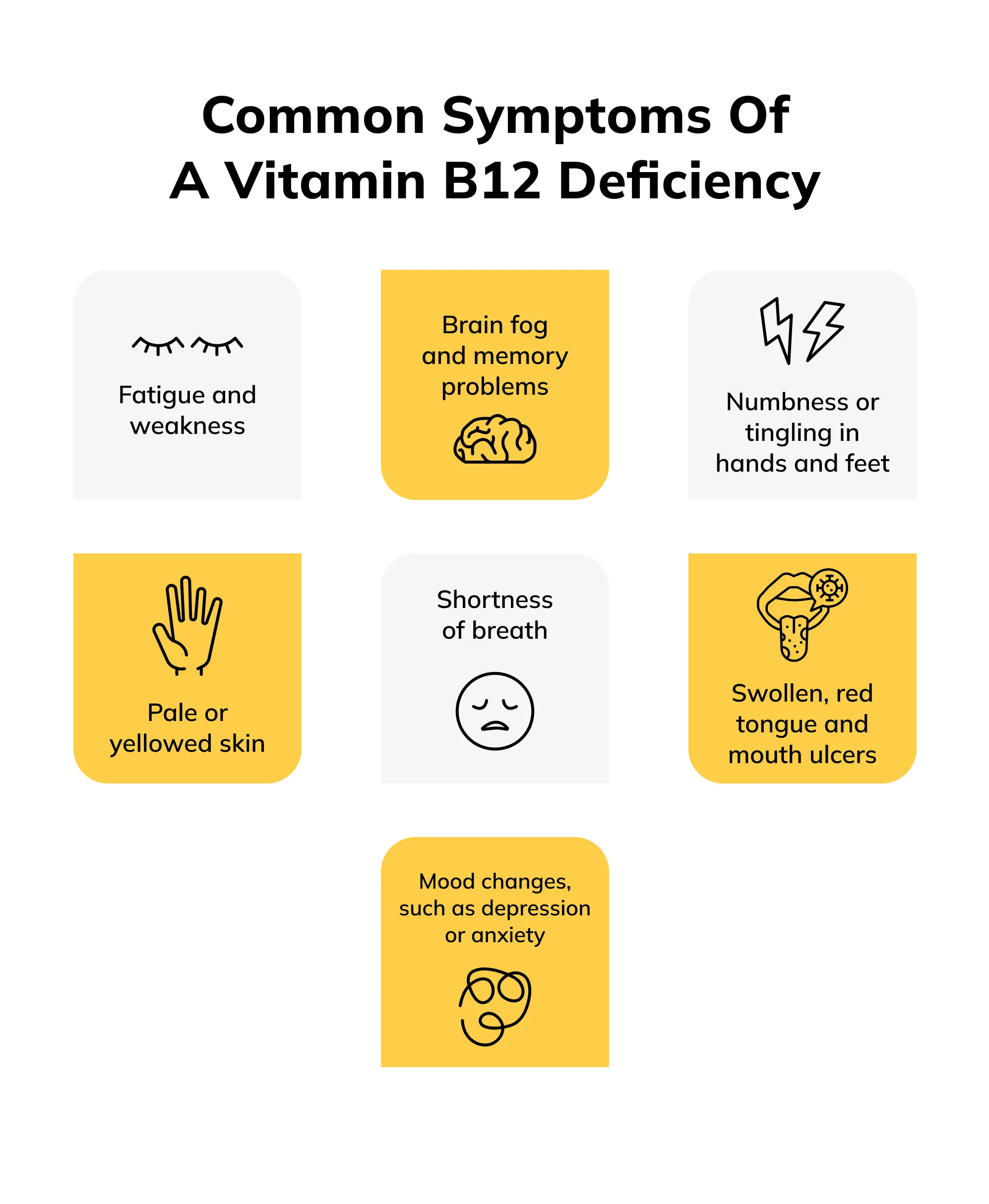 - Common symptoms of a B12 deficiency include fatigue, brain fog, numbness or tingling in the hands or feet, and mood changes.