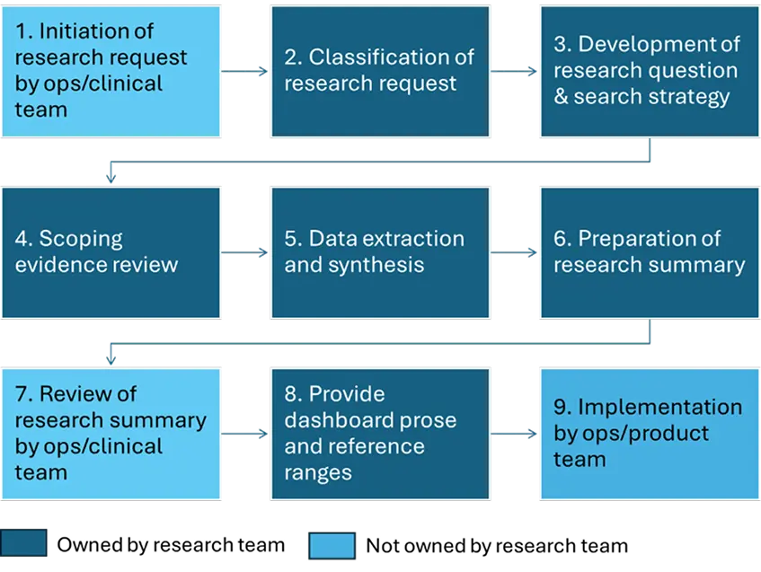 Following completion of the research summary, which includes evidence-guided recommendations from the research team, the operations and clinical teams decide whether to action the research recommendations and/or whether further research is required before reaching a decision.