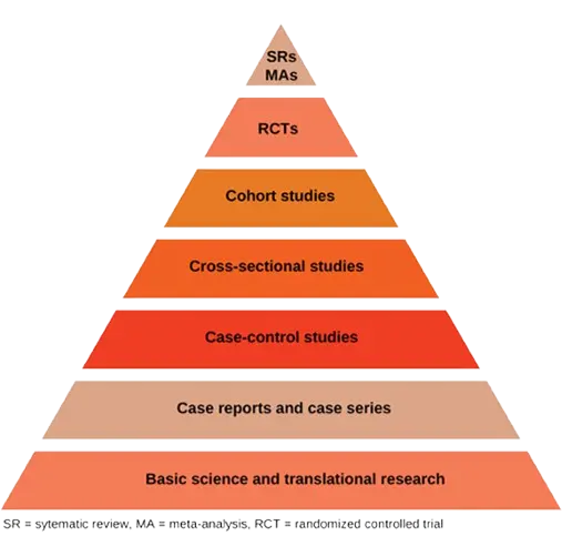 As shown below, the bottom tiers of the 6S Pyramid pyramid incorporate the study designs shown in the Evidence Pyramid and, above those, the systematic reviews and meta-analyses (labeled 'Syntheses'). The higher tiers of evidence include research that has been further aggregated and summarized by experts.
